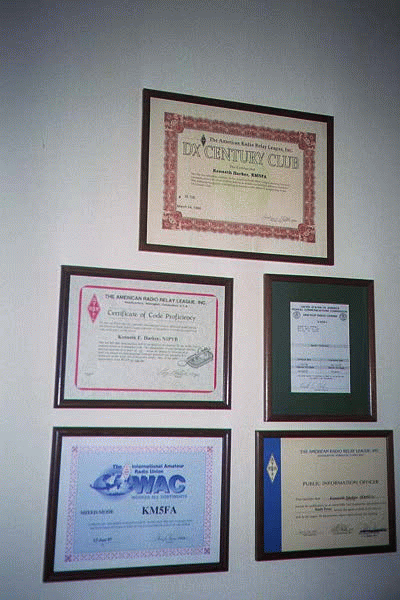 These were the awards and certificates that were hanging on the wall of my apartment in Austin, Texas, around 1997. They include DXCC, WAC, my license (KM5FA at the time,) an ARRL Code Proficiency Certificate (10 WPM,) and a certificate for my appointment as an ARRL Public Information Officer in the South Texas (STX) section. |