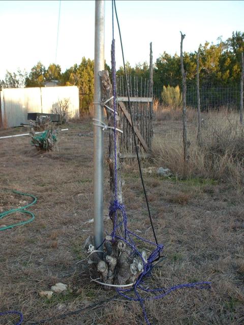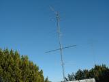 A mast made out of the boom of a large 20M monobander, at K5TR in 2001. It was used to support a dipole, I think for 80M, before the towers were installed. |