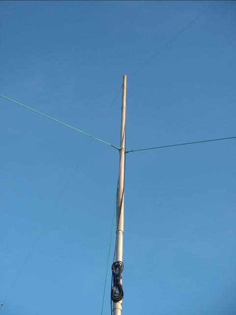 A view of the mast higher up. It was guyed with very bright green nylon rope. |